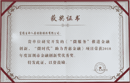 近日,由深圳市人民政府金融办组织开展的2018年度深圳金融创新奖评选工作落下帷幕。继2016年后,富德生命人寿凭借《“微服务”推进金融创新,“微时代”助力普惠金融》(以下简称“微服务”)项目,再次荣获深圳市金融创新优秀奖。据悉,同期获得优秀奖的还有招商银行、微众银行、中国平安人寿等17家公司的金融创新项目。