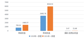 同城快递业务占比提升。一季度,全省同城快递业务量1465.57万件,比上年同期增长84.8%;同城快递业务量占全省快递业务量的19.5%,占比较上年同期提高1.9个百分点。