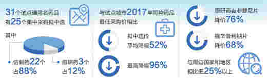 拟中选结果显示,31个试点通用名药品有25个集中采购拟中选,成功率81%。其中,通过一致性评价的仿制药22个,占88%,原研药3个,占12%。与试点城市去年同种药品最低采购价相比,拟中选价平均降幅52%,最高降幅96%。原研药吉非替尼片降价76%,福辛普利钠片降价68%,与周边国家和地区相比低25%以上。