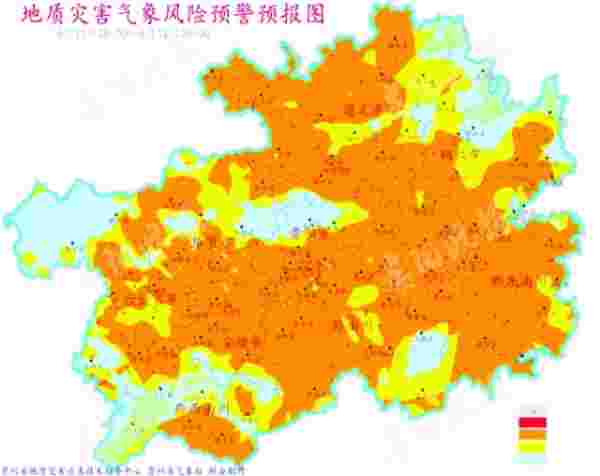 橙色预警(即地质灾害气象风险高)共71个县(市、区),分别为:黔东南州(凯里、麻江、雷山、镇远等16个县市)、安顺市(西秀区、关岭县、镇宁等6个区县)、云岩、南明、白云、乌当、花溪、清镇、开阳、观山湖、七星关、大方、金沙、纳雍、织金、六枝、钟山、水城、都匀、长顺、福泉、贵定、罗甸、平塘、独山、惠水、龙里、瓮安、普安、晴隆、思南、石阡、玉屏、碧江、万山、江口、余庆、绥阳、湄潭、凤冈、播州、仁怀、汇川、红花岗、桐梓、赤水、习水、道真、正安、安龙、册亨。